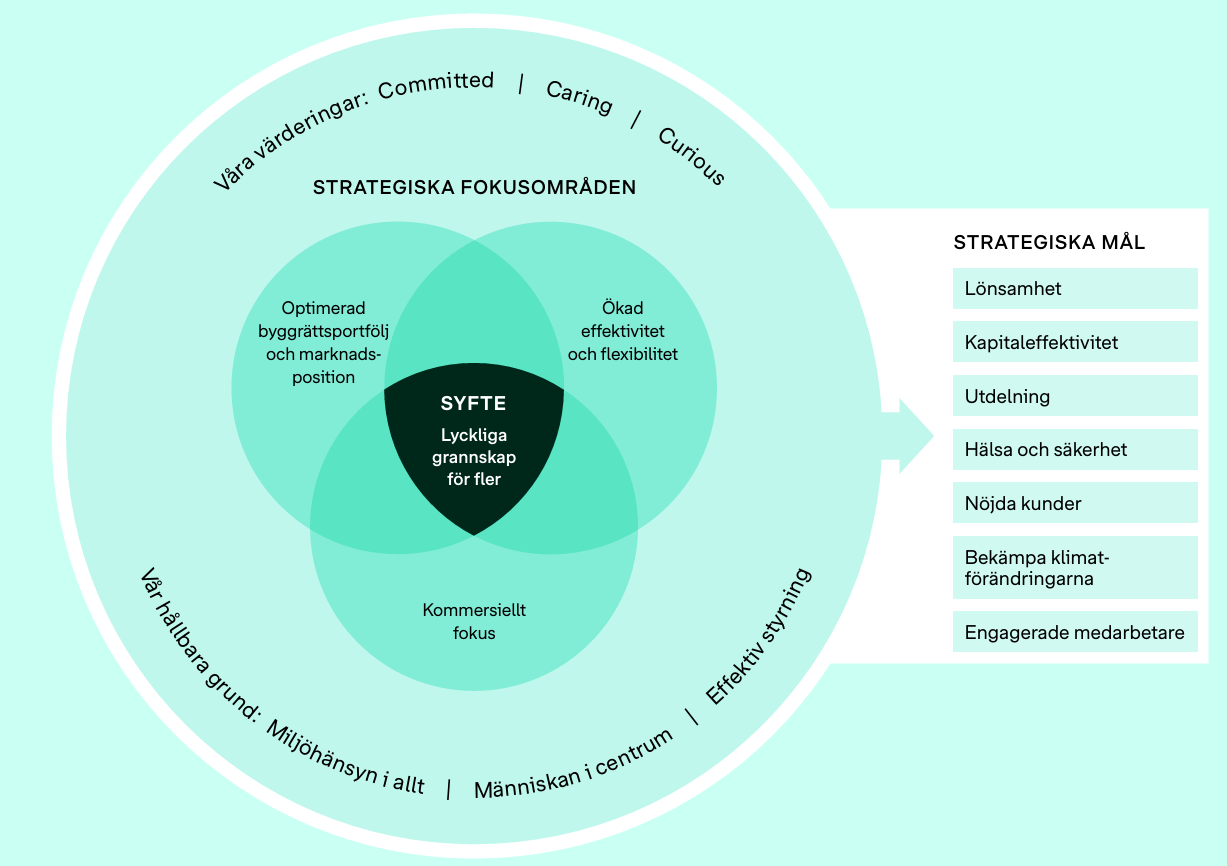 Vi ska stärka vår affär och vår lönsamhet och se till att vi har finansiell kapacitet att dra nytta av de affärsmöjligheter som marknaden erbjuder. Våra tre strategiska fokusområden, våra värderingar och vår hållbara grund ska samspela för att vi ska få ut det bästa av vårt arbete. Läs mer om vår hållbara grund Miljöhänsyn ska genomsyra allt vi gör, vi sätter människan i centrum och effektiv styrningsmodell.