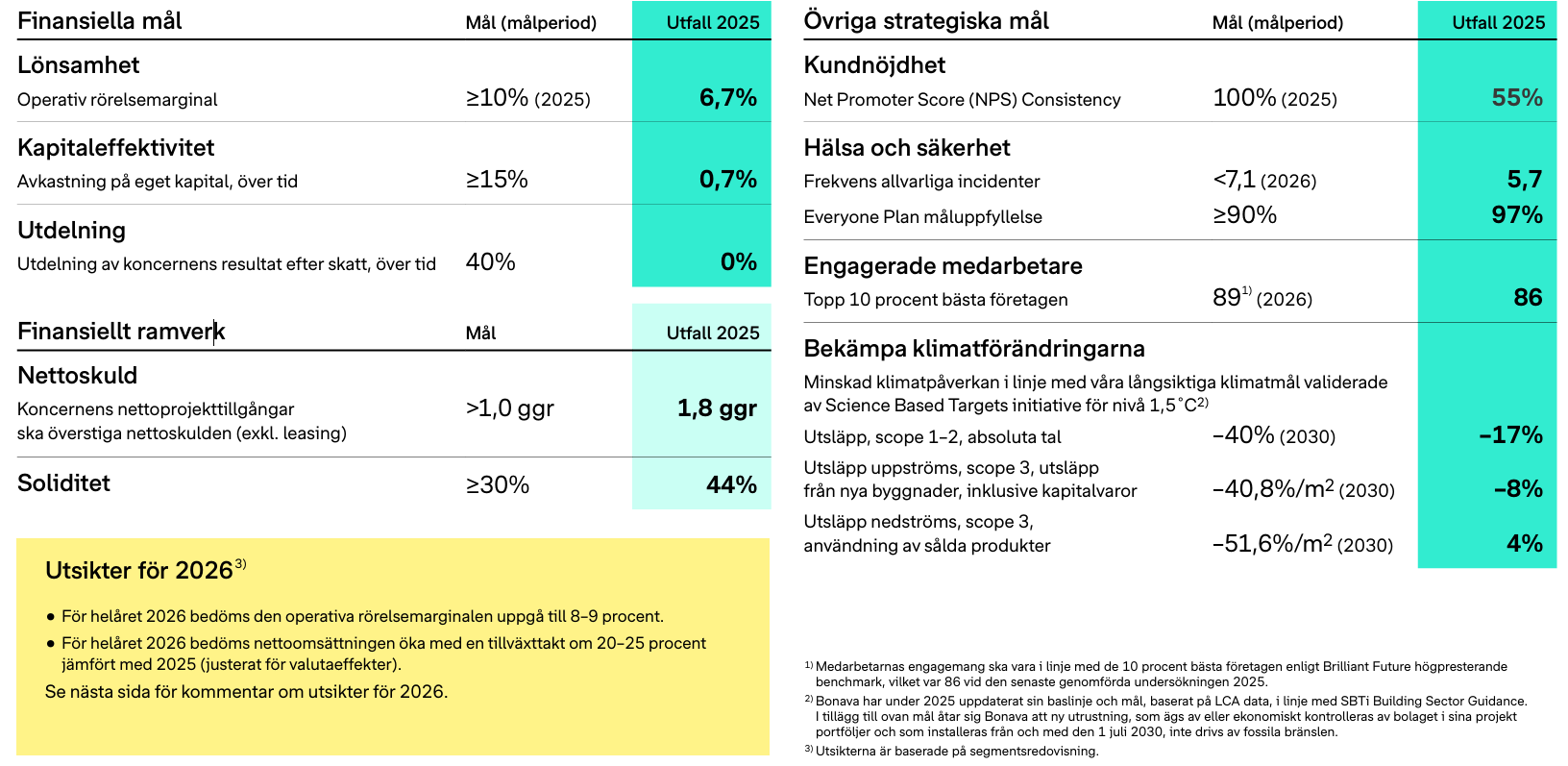 Nedan tabell visar utfall och mål per den sista december 2025.